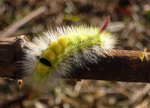 The adult moth is a large, grey species with extravagantly furry legs, often seen in May and June when males are drawn to lights at night. But it is the caterpillar, visible between July and October, that really turns heads. Bright green or yellow, with bold tufts of hair along its back, the pale tussock caterpillar looks almost too flamboyant to be real. The caterpillar has four dense, brush-like tufts on its back, ranging from creamy yellow to pinkish brown, and a distinctive tail-like tuft of reddish or brown hairs. When disturbed, it arches its body to reveal sudden flashes of black between the tufts, a dramatic warning display.