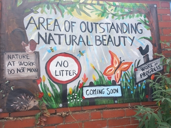 We have also spread our gardening up to the charity and recycling bins further away from the station, where there has been a fly-tipping problem, we have planted up donated bathtubs and the bins have been moved for us to paint the ground with positive messages and wildlife designs. Even since the bathtub planters have been there the amount of fly-tipping has reduced.