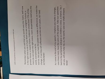 The pupils showed clear understanding of the topic in question and the focus of their speech. They said how much they enjoyed learning about chalk rivers and why we need to protect them. They felt like they were helping protect these valuable habitats by persuading others to take action.