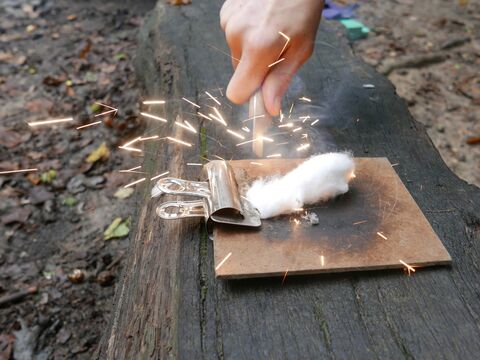 Fire lighting with a fire striker and making sparks to ignite cotton wool on a clipboard.