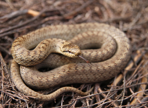 Similar in appearance to the adder, the smooth snake can be distinguished by its more slender body, round pupil and less well-formed dark pattern on its back. It is usually grey or dark brown in colour.